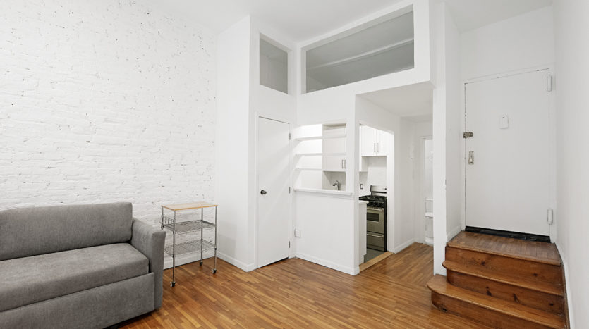 The sunken living room adds a touch of drama and coziness, inviting you to unwind and bask in the comfort of your personal sanctuary. High ceilings soar overhead, creating an airy ambiance that enhances the feeling of spaciousness, giving the studio an open and liberating atmosphere.